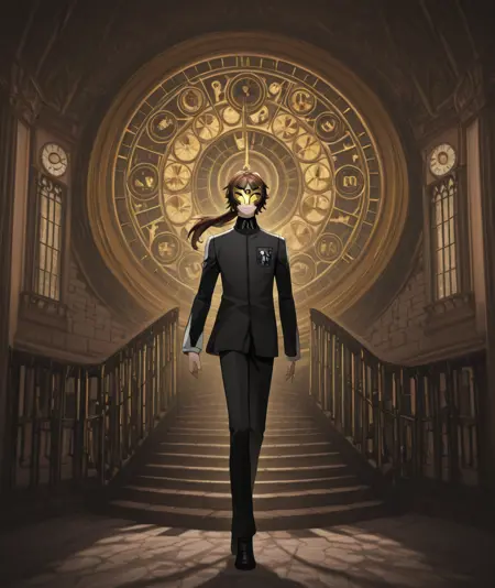 megaten,philemon,1boy,black_shirt,brown_hair,bug,butterfly,closed_mouth,long_hair,mask,persona,persona_2,ponytail,shirt,pants,shoes,smile,solo,uniform,yellow_eyes