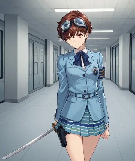 megaten,uchida_tamaki,1girl,blazer,brown_eyes,brown_hair,comp_(megami_tensei),goggles,jacket,karukozaka_uniform,katana,shin_megami_tensei,shin_megami_tensei:_if...,shirt,shoes,short_hair,skirt,socks,solo,sword,uniform,weapon