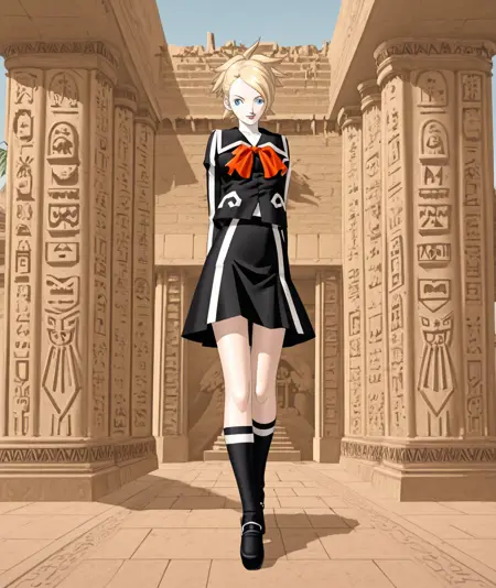 megaten,lisa_silverman,1girl,black_skirt,blonde_hair,blue_eyes,bow,bowtie,orange_bow,orange_bowtie,persona,persona_2,persona_2_tsumi,seven_sisters_uniform,skirt,solo,uniform, kneehighs, black_socks, shoes, black_shoes