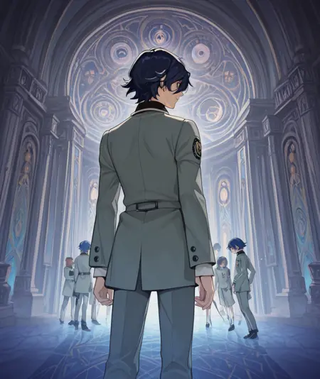 megaten,toudou_naoya,1boy,black_hair,blue_hair,closed_mouth,earrings,facing_away,grey_pants,hair_over_eyes,jewelry,long_sleeves,pants,persona,persona_1,school_emblem,single_earring,st._hermelin_uniform,uniform,brown_eyes