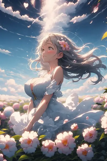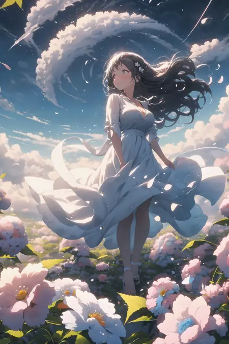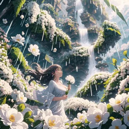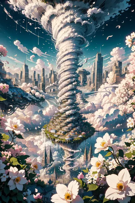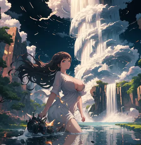 トルネード、夢のような背景、滝、風、雲、反射、浮遊、白い花、飲む
