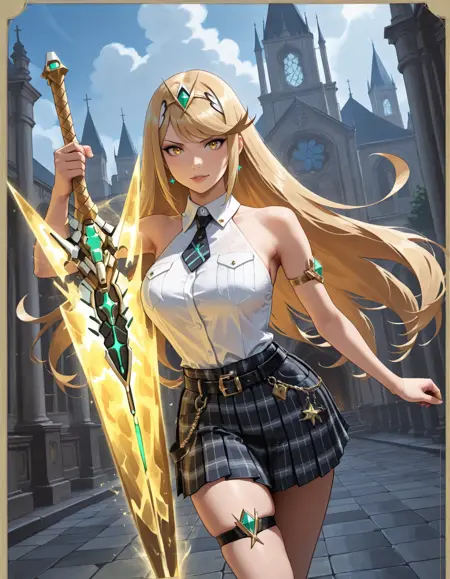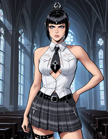 Invoke with sleeveless shirt, shirt collar, shirt pockets, single thigh strap, pleated skirt, belt, chains, (small necktie) (untucked shirt:1.2)