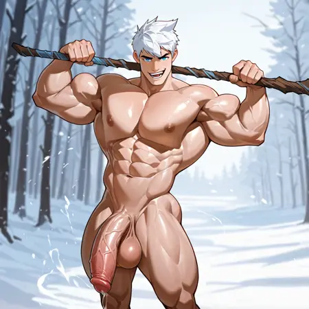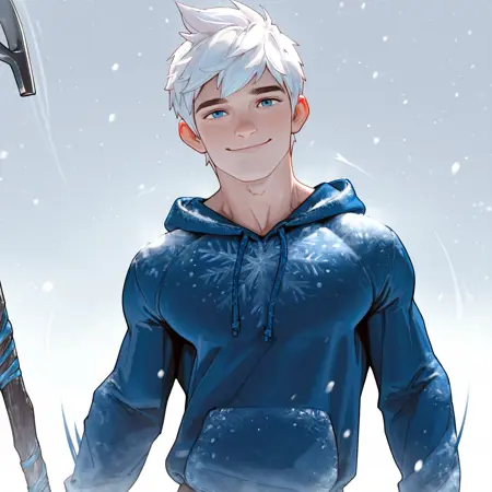 <lora:JACK_FROST:1> jackfrost, male focus, 1boy, white hair, solo, short hair, smile, blue eyes, hood, hoodie, looking at viewer, mature male, muscular male, bara, muscular, hood down, holding, upper body, realistic, teeth, staff, long sleeves, closed mouth, pants, simple background, outdoors
