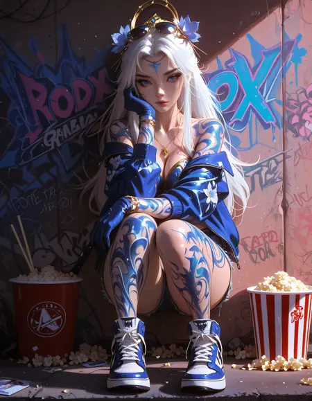 推荐标签:1girl,蓝眼睛,长发,白发,珠宝,身体纹身,发饰,盘发,面部纹样,手臂纹身,主服装,赤脚,纹身,全臂纹身,裸露肩膀