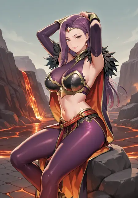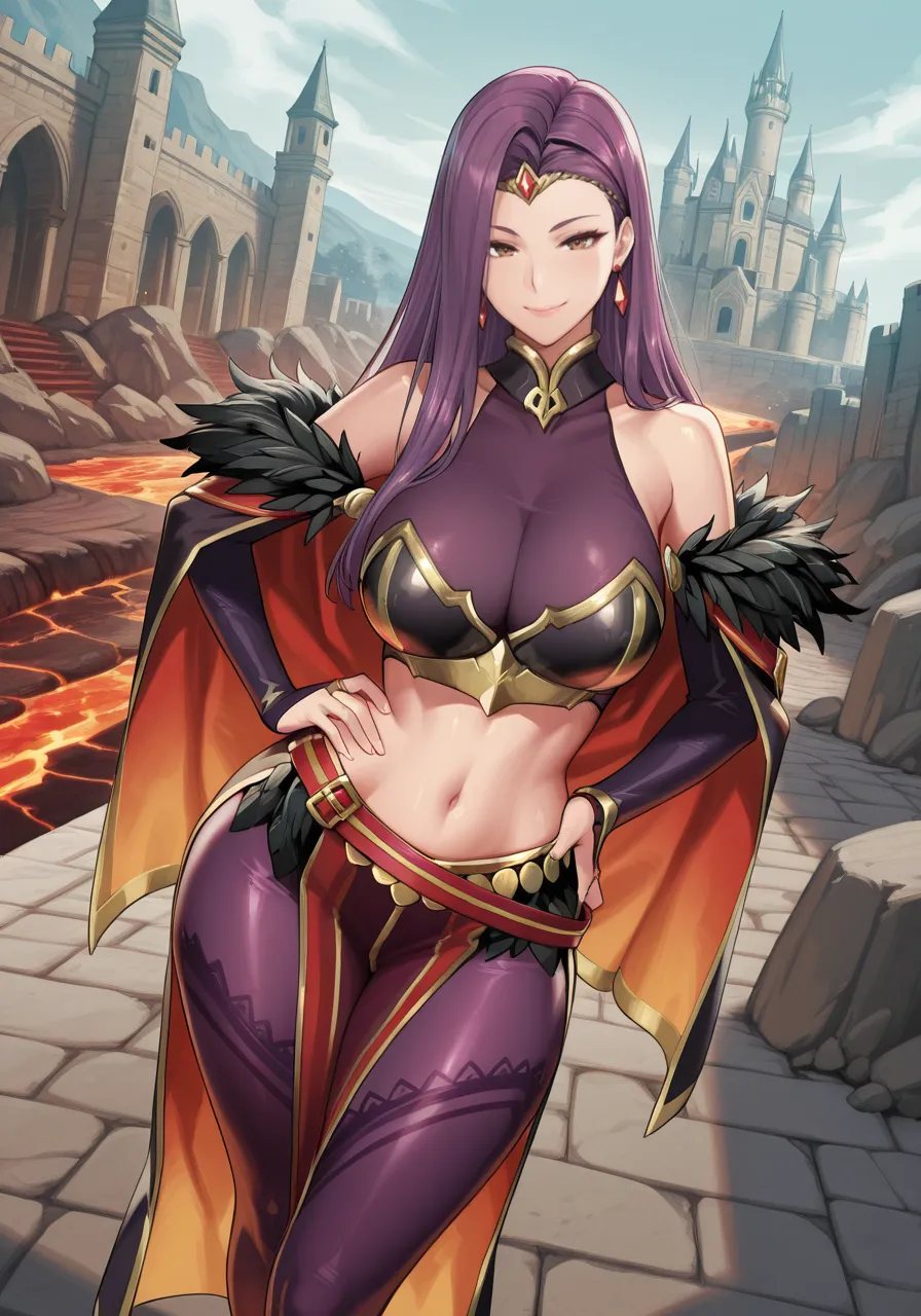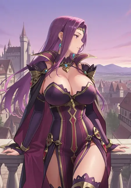 デフォルト:SonyaOG、紫目、ドレス、マント、ジュエリー、冠、手袋、青いイヤリング、胸元、ハイヒール、タイツ、骨盤カーテン