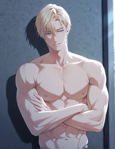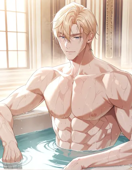 Damien von Thisse, blonde, short hair, blue eyes, hair down, bangs