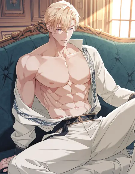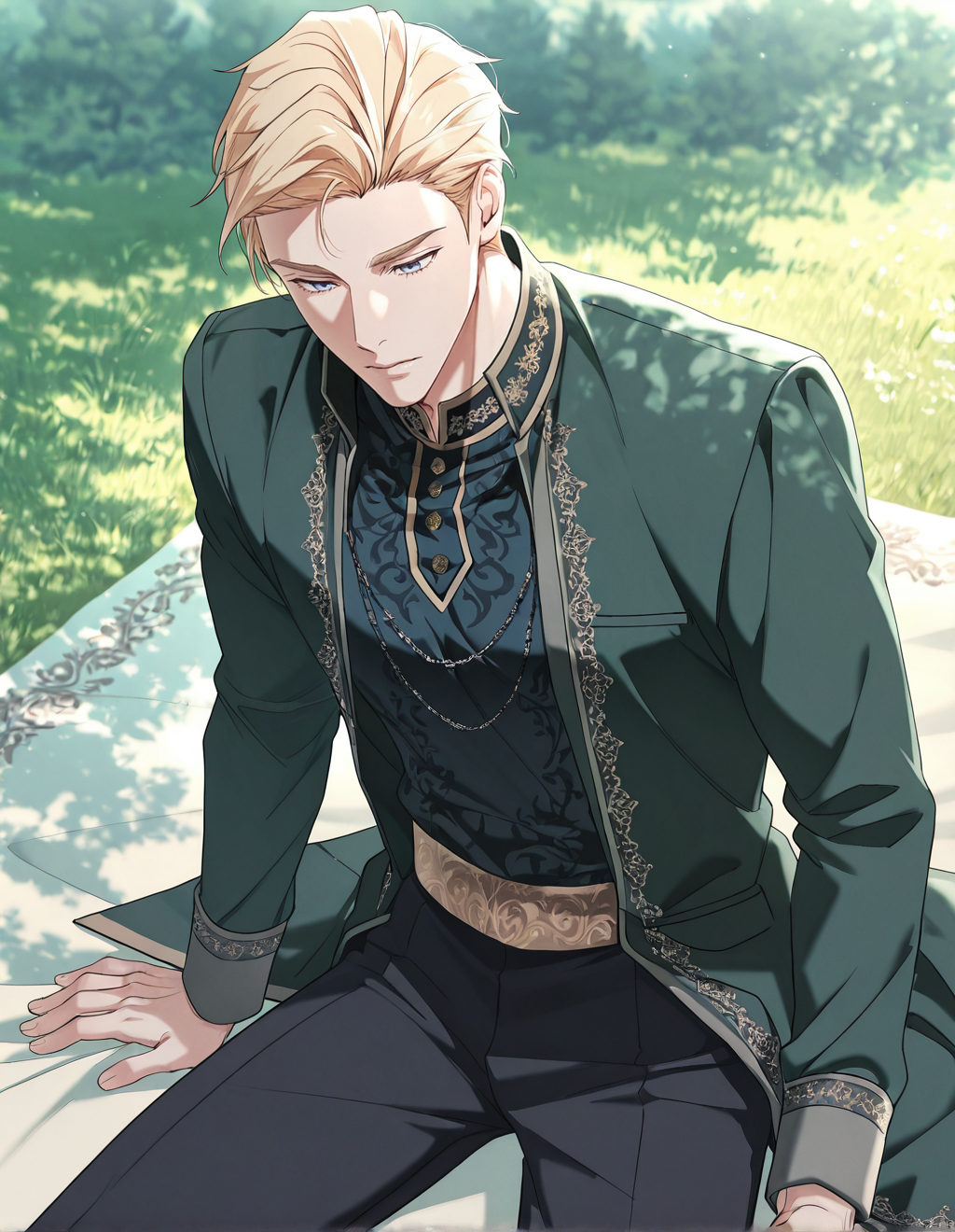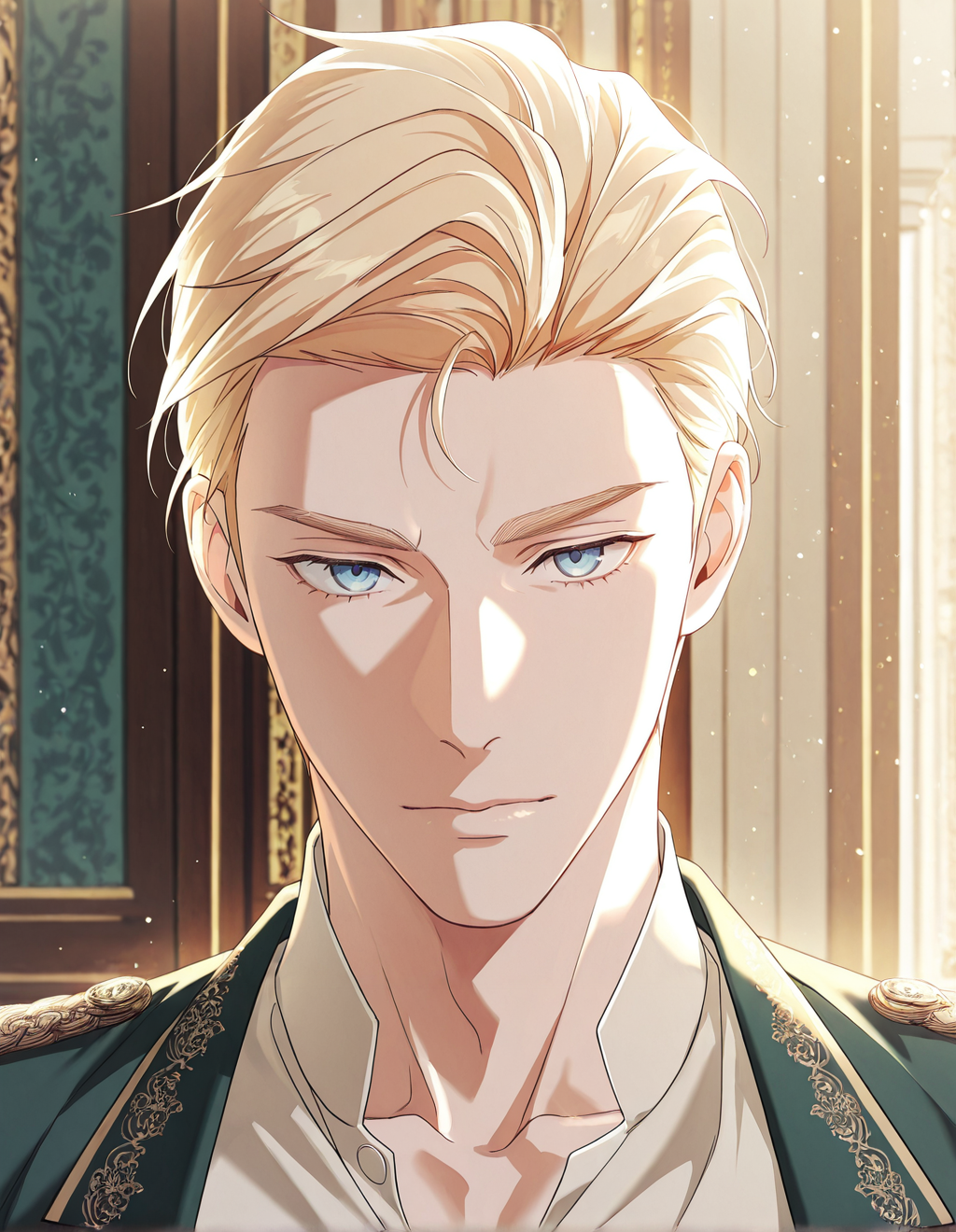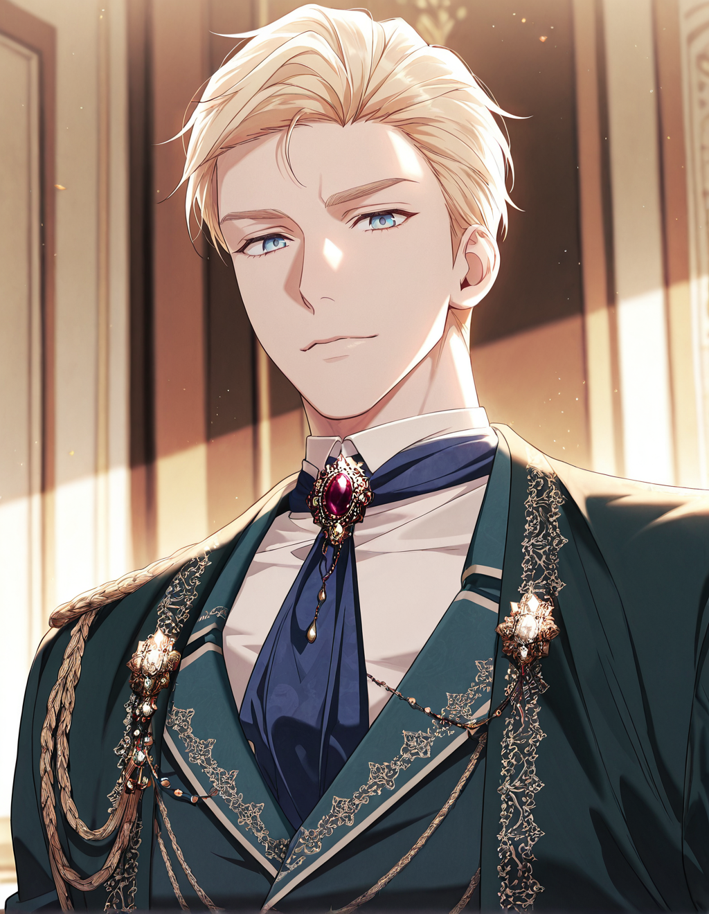 Damien von Thisse, blonde, short hair, blue eyes, slicked back hair