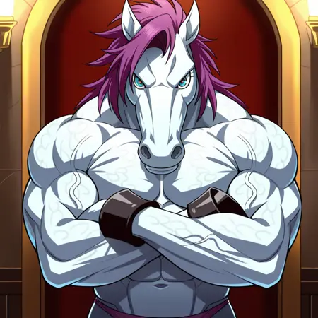 dv_jami, 1boy, monster, horse, horse head, colored skin, white skin, muscular male, purple hair, hooves, veins