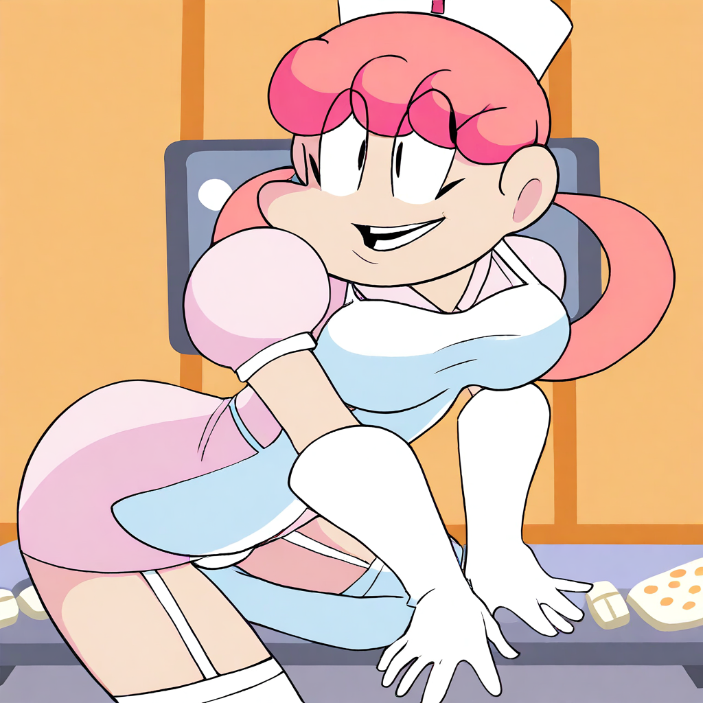 nurse joy, pink hair, nurse clothes, nurse cap, white socks, long socks