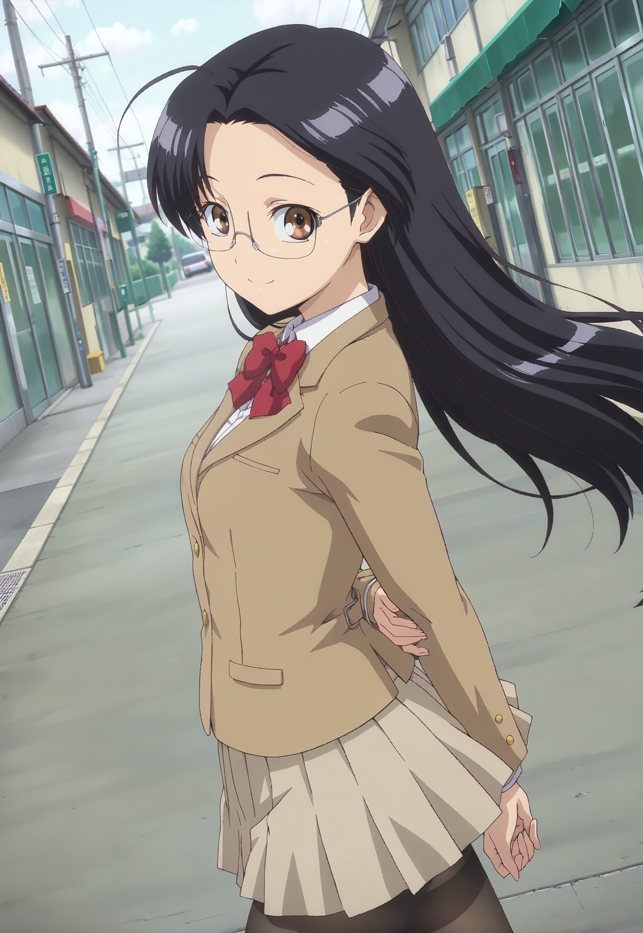 Shirakawa Sumire,small breasts,Glasses,Long hair,Dark hair,school Uniform,Blazer,Shirt,Red bow tie,Skirt,Pleated skirt,Tights