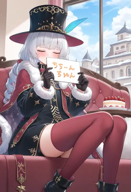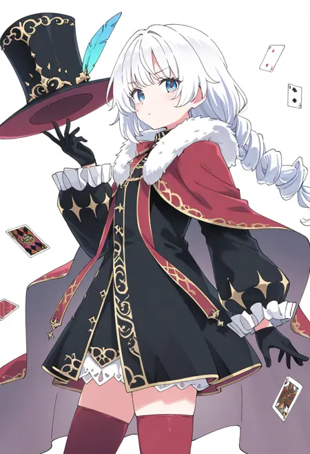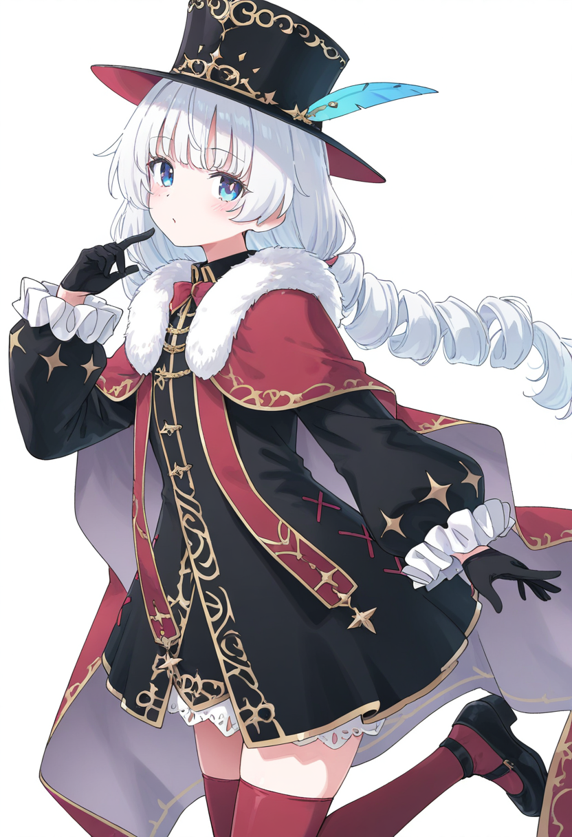 black shirt,red thighhighs,black footwear,blue eyes,hat,white hair,black gloves,thighhighs,fur trim,lora:Reverse\_1999\_Charlie:0.8
