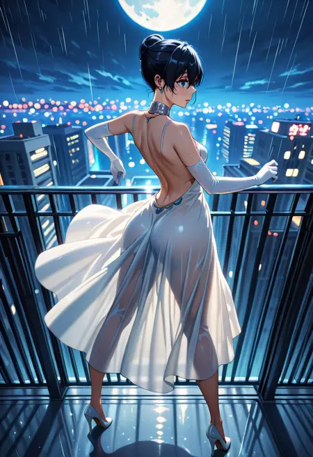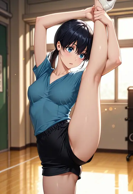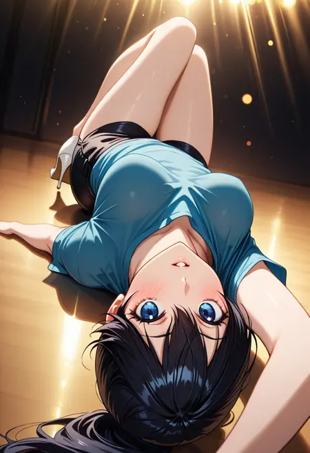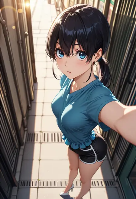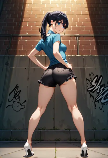 角色主服装:蓝色衬衫、短袖、无胸罩、黑色短裤、短裤、荷叶边、马尾辫、白鞋、白色高跟鞋