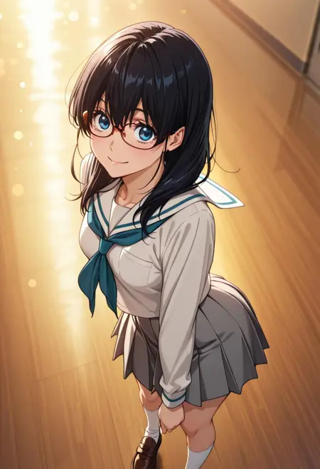 额外服装(校服):白衬衫、长袖、水手领、水手服、灰色裙子、百褶裙、发丝垂肩、戴眼镜、白袜、棕色鞋子