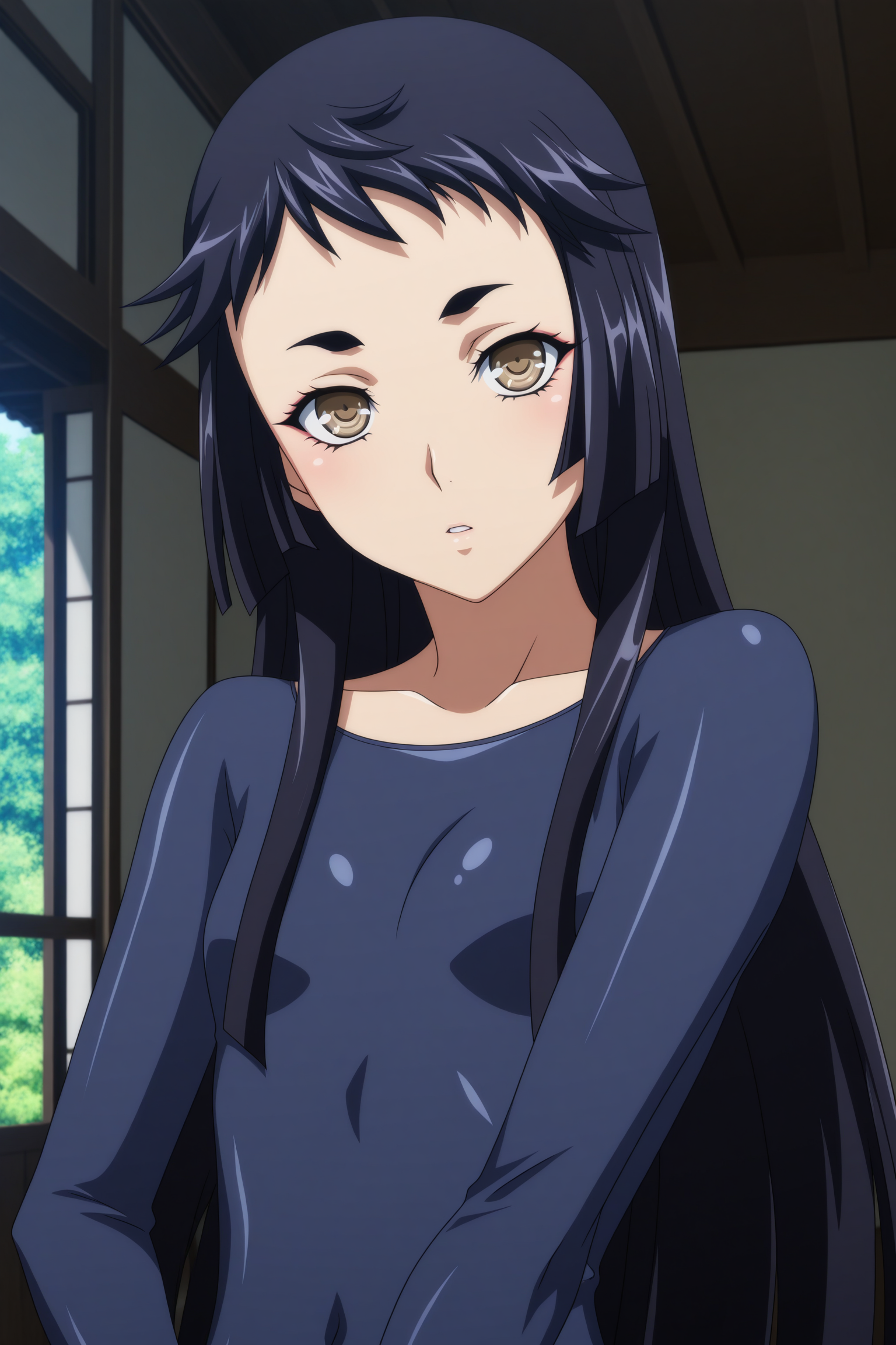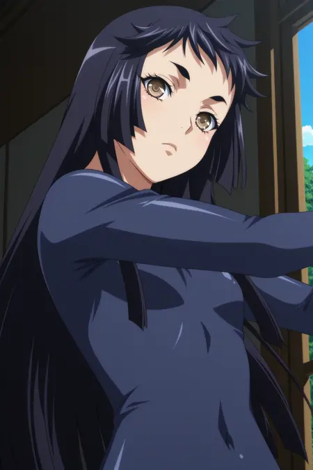 ashiya douman, 长发, 黑发, 短刘海, 纤细刘海, 平直侧发, 棕色眼睛, 长袖, 运动紧身衣, 黑色紧身衣