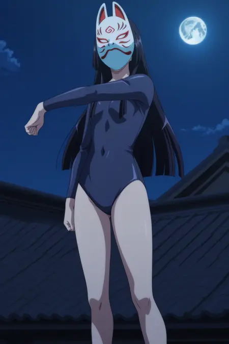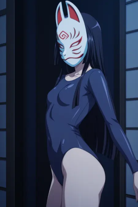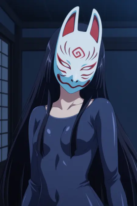 ashiya douman, 长发, 黑发, 短刘海, 纤细刘海, 平直侧发, 狐狸面具, 长袖, 运动紧身衣, 黑色紧身衣