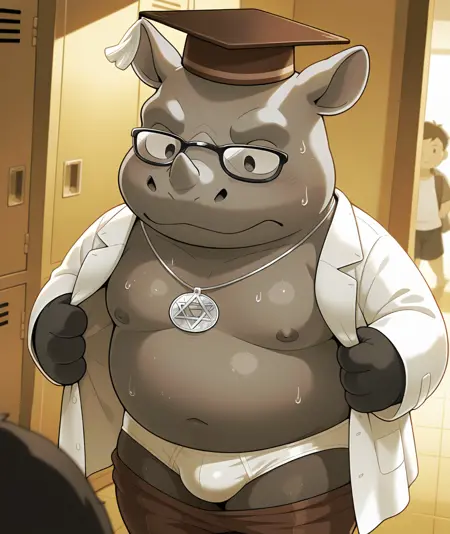 tsalrin, rhino_boy, 1boy, (chibi:0.5), plump, ((black_trapezoid_eyewear)), dot_eyes, no_sclera, fewer_digits, ((solo++)),