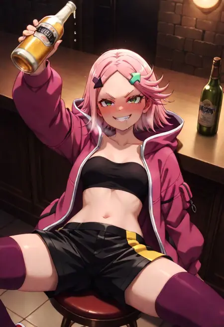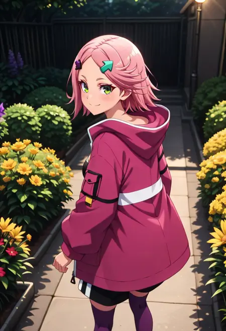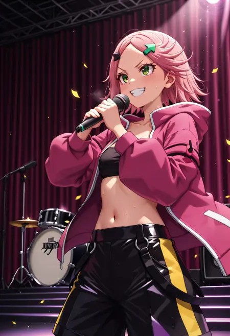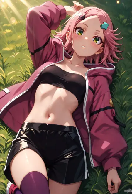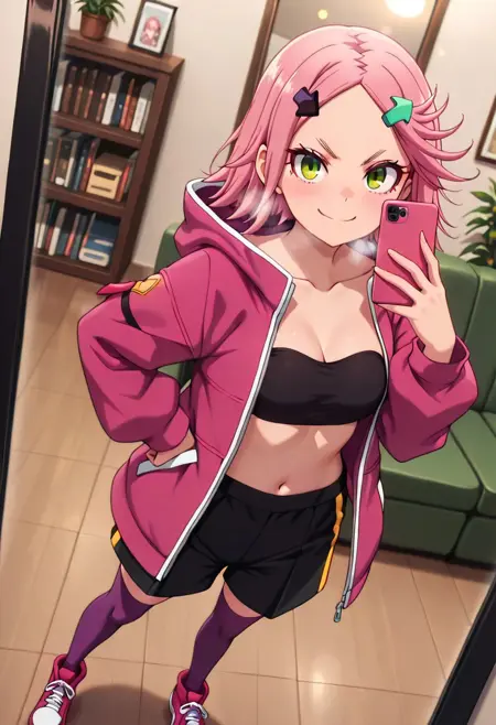 主な衣装:ピンクのジャケット、開いたジャケット、長袖、フードを下ろした状態、ブラックのトップス、チューブトップ、お腹、へそ、ブラックのショーツ、長い靴下、パープルの靴下、スニーカー、