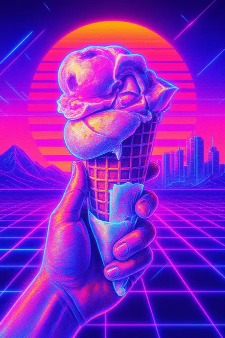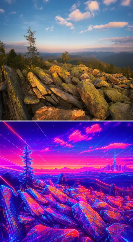 为任何图像注入充满电力的复古未来主义风格——鲜艳的霓虹色调、梦幻的渐变和蒸汽波氛围。