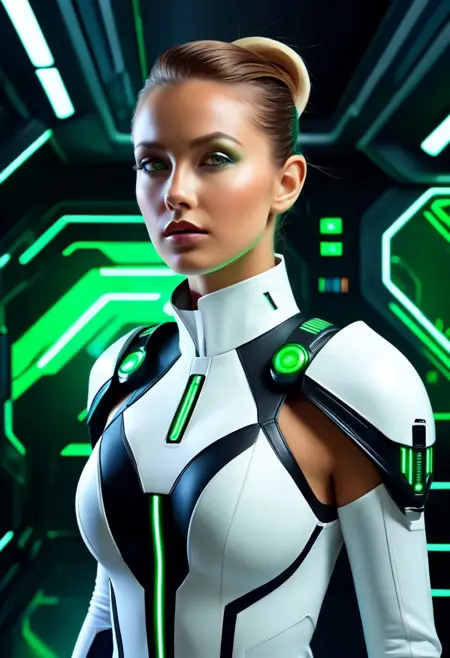 form-fitting futuristic costume, predominantly white with striking black and green accents, featuring high-tech elements like illuminated buttons and sleek panels,