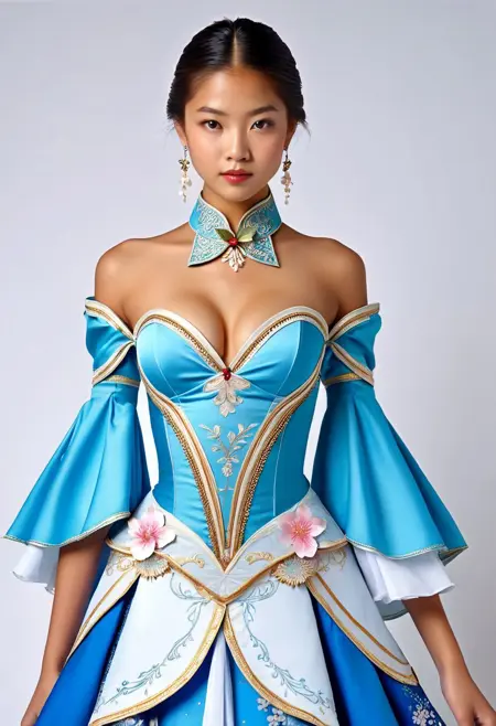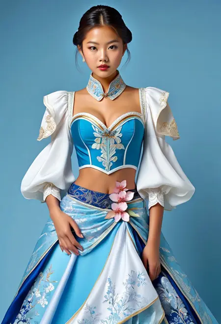 intricate costume featuring shades of blue, white, and hints of gold, fitted top has a sweetheart neckline with decorative elements and a stylish collar, flowing sleeves add elegance, a floral motif resembling cherry blossoms adorns the waist, layered skirt flows outward, showcasing a variety of fabric styles and patterns,