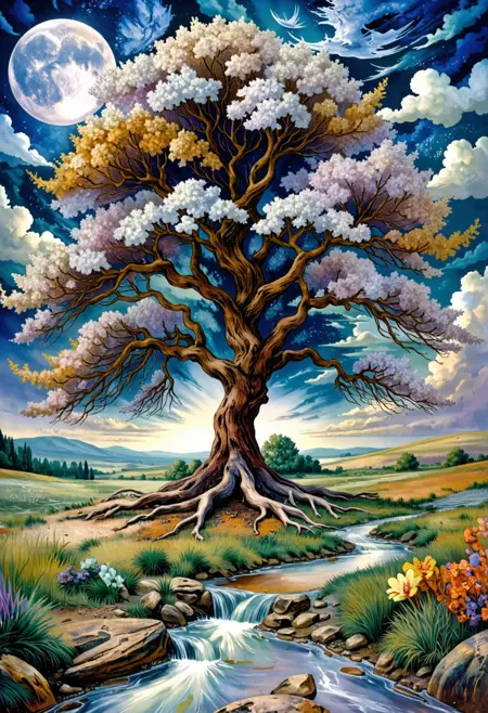 This style is trained on set of 22 AI generated Images to capture imaginary psychedelic esoteric vibes trying to revive 70-80sh Hippie Movement Art.