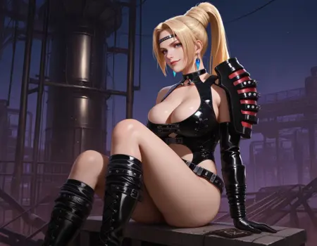 默认服装的正面提示:1girl, rachel \(ninja gaiden\), 金发,长发,马尾,珠宝,耳环,蓝眼睛,大胸,肘部手套,盔甲,露胸,肩甲,皮革,腰带,过膝靴,靴子