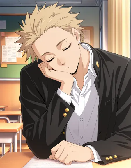 <lora:rintarou_tsumugi-kaoru_hana_s1-ixl-anime-soralz:1>, 린타로ツ무기(카오루하나), 단발, 금발, 뾰족한 머리, 귀걸이, 갈색 눈