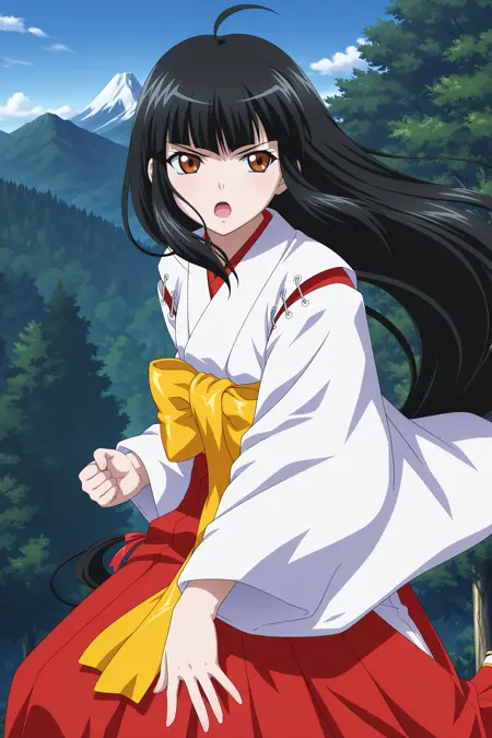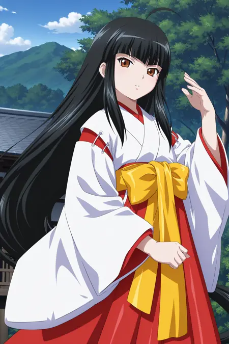 choushou shifu, long hair, black hair, red ribbon, low-tied long hair, ahoge, sidelocks, v-bangs, brown eyes, miko, long sleeves, wide sleeves, kosode, yellow bow, waist bow, red skirt, hakama skirt, tabi, zouri