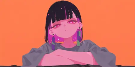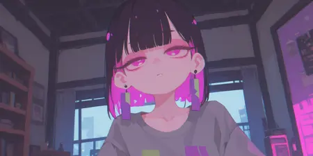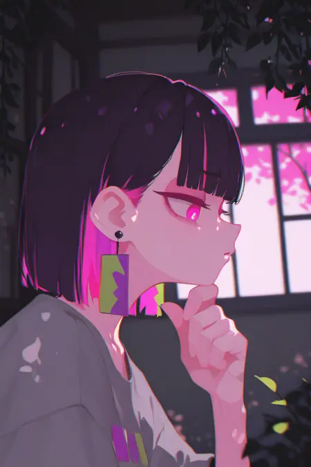 1个女孩,短发,齐刘海,黑发,粉眼睛,紫发,多色发,双色发