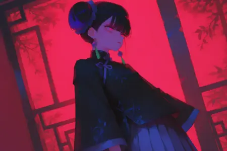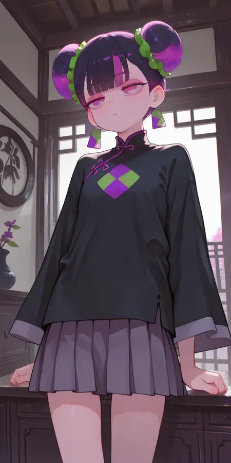 发髻,双发髻,中式服装,宽袖,裙子,百褶裙,长袖,(上衣,黑上衣),连衣裙,脚踝带,鞋子,平底鞋,耳环
