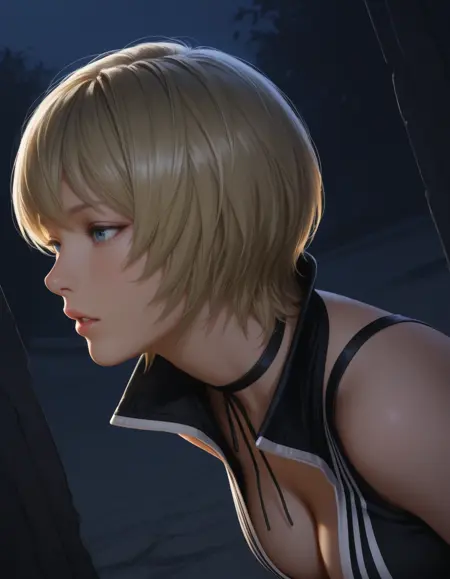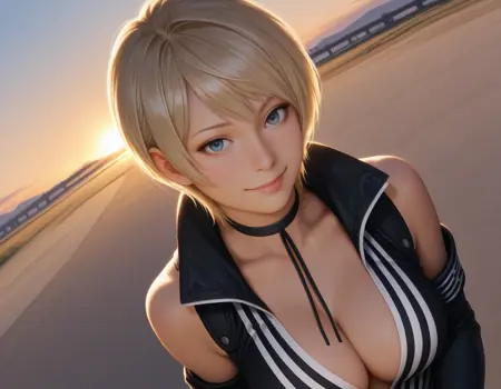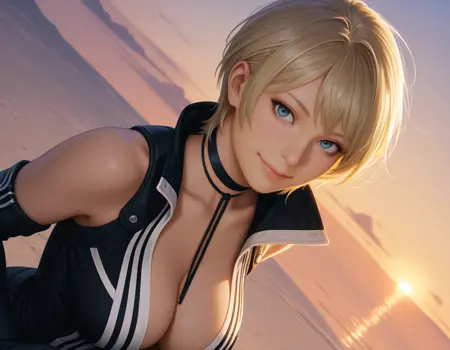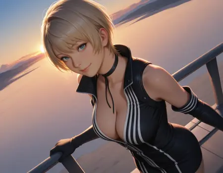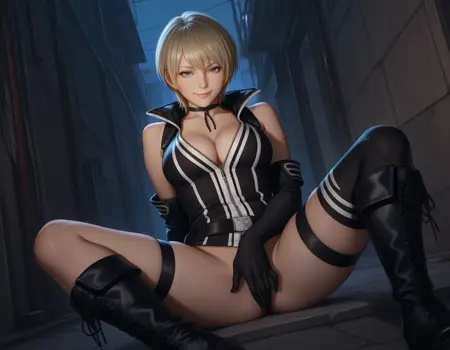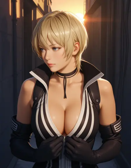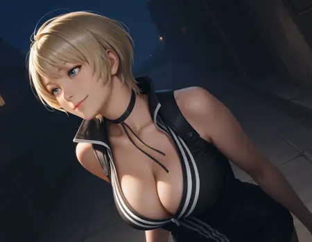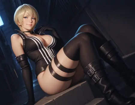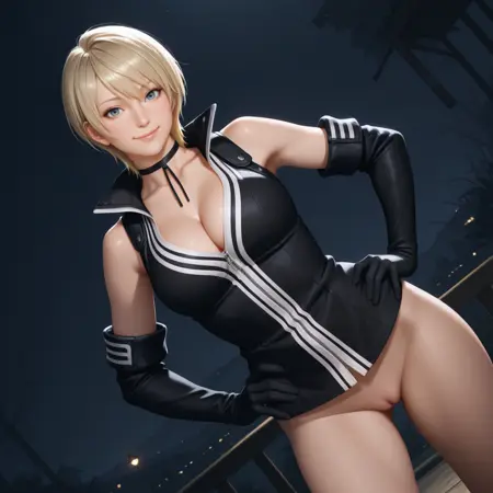 Positive prompt for default outfit: 1girl, NG2Sonia, short hair, blonde hair, choker, blue eyes, breasts, black clothing, bare shoulders, cleavage, gloves, elbow gloves, thighhighs, thigh strap, boots