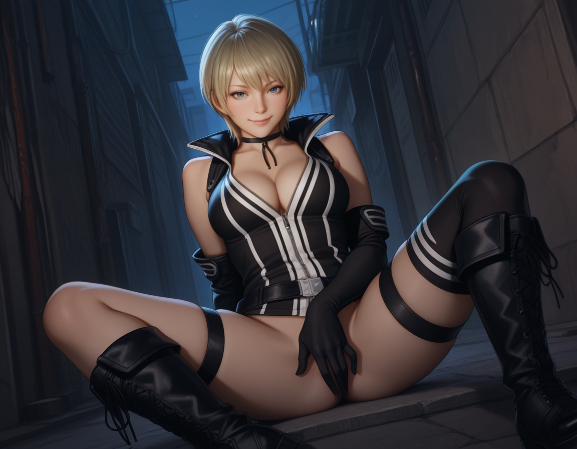 默认服装的正面提示:1girl, NG2Sonia, 短发, 金发, 项圈, 蓝眼睛, 乳房, 黑色服装, 裸露肩膀, 乳沟, 手套, 肘部手套, 过膝袜, 大腿绑带, 靴子