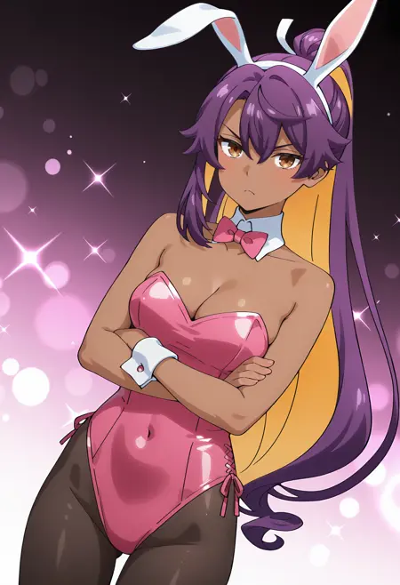 OnmyoYura, dark-skinned female, brown eyes, multicolored hair, purple hair, blonde hair, very long hair, high ponytail, white hair ribbon, curtained hair, single sidelock — For some reason the model will sometimes put white/silver hair incorrectly on the sidelock, so you can add "white hair, silver hair" to negatives to combat this