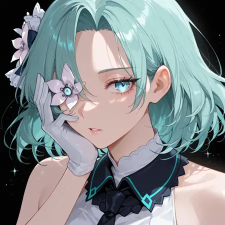 짧은 머리, 아쿠아마린 색 머리, 어깨 길이 머리, 머리 장식, 꽃 장식, 꽃 머리 장식, 한쪽 눈, 눈에 꽃, 한쪽 눈 가림, 아쿠아마린 색 눈, 갈라진 앞머리, 양쪽으로 흐르는 앞머리, 큰 가슴, 쉬어 드레스, 드레스, 흰 드레스, 소매 없음, 소매 없는 드레스, 마이크로 드레스, 어깨 노출, 칼라 있는 드레스, 주름진 드레스, 단추, 드레스 아래쪽 절개, 안쪽 검은 소재, 넥타이, 검은 넥타이, 아쿠아마린 안감, 검은 코트, 안감 코트, 흰 장갑, 하이힐, 검은 하이힐, 스트랩 힐, 높은 힐, 한쪽 허벅지 긴 양말, 검은 허벅지 긴 양말,