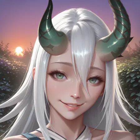 Trigger Words: Shillae, demon girl, horns, very long hair, White hair, hair between eyes, green eyes, large breasts,