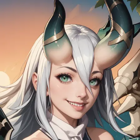 トリガー語: シラ、悪魔の少女、角、非常に長い髪、白髪、額の間の髪、緑の目、大きな胸、