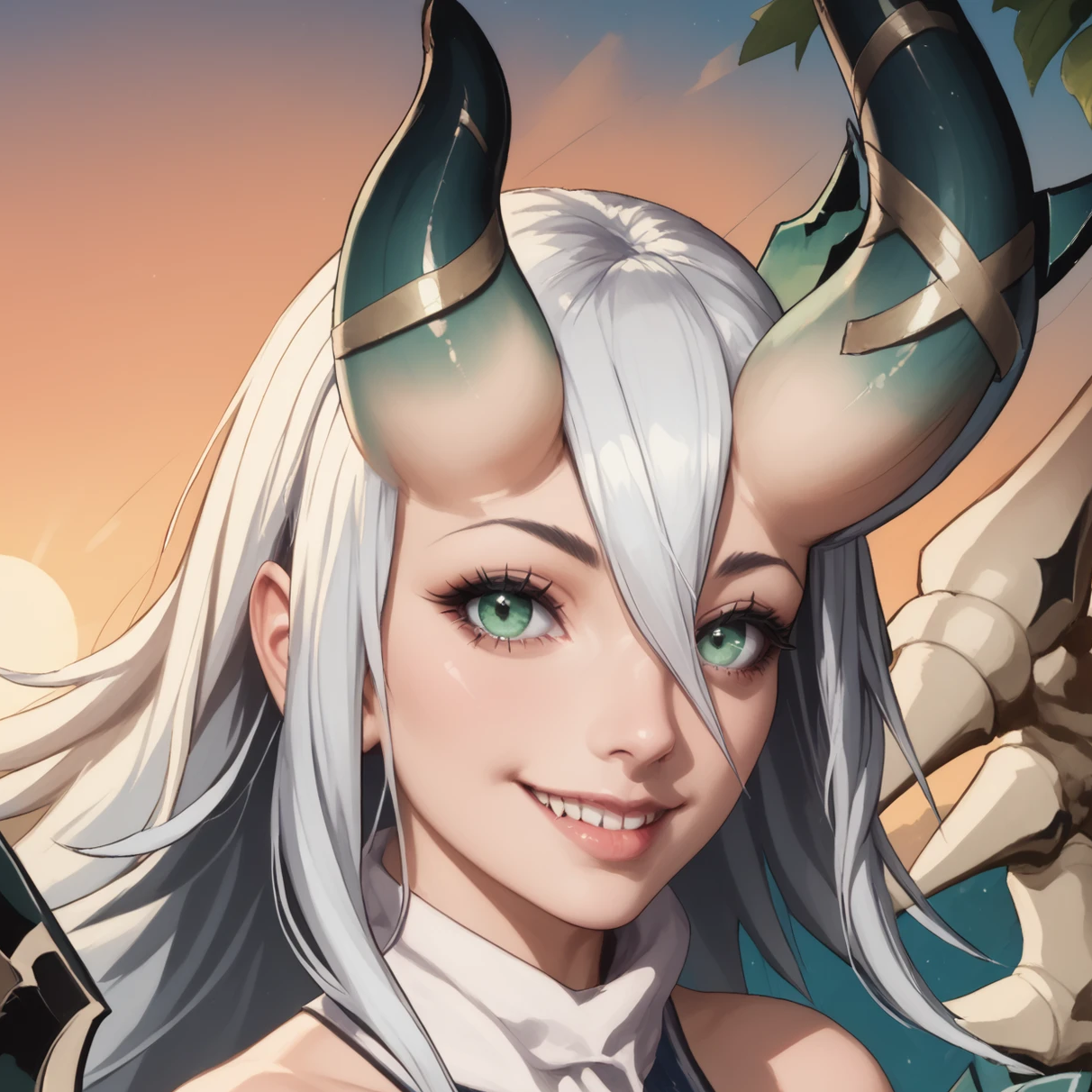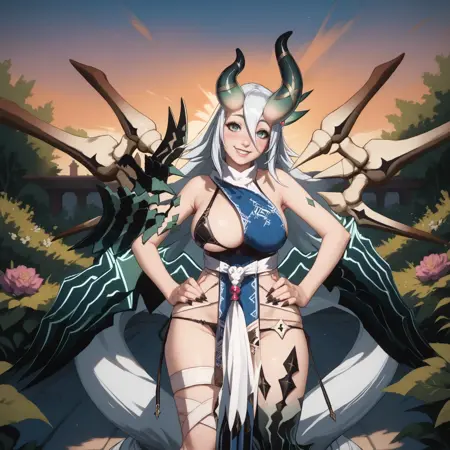 Trigger Words: Shillae, demon girl, horns, very long hair, White hair, hair between eyes, green eyes, large breasts,
