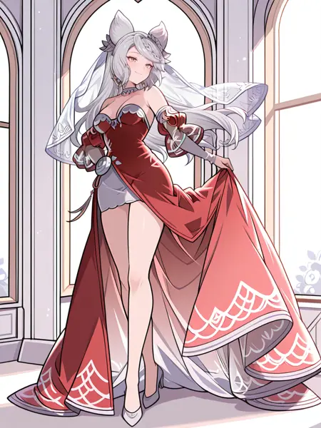 dvl_fr, dvl_wed, braid, long hair, grey hair, animal ears, yellow eyes, hair flowers, white choker, bridal veil, off-shoulder dress, red dress, puffy sleeves, white pencil skirt, white heels