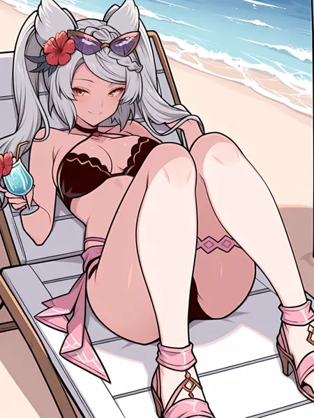 dvl_fr, dvl_sum, braid, long hair, grey hair, twintails, animal ears, yellow eyes, eyewear on head, sunglasses, hibiscus hair flower, lace-trimmed bikini, black bikini, short sleeves, detached sleeves, pink sash, pink thigh strap, high heel sandals