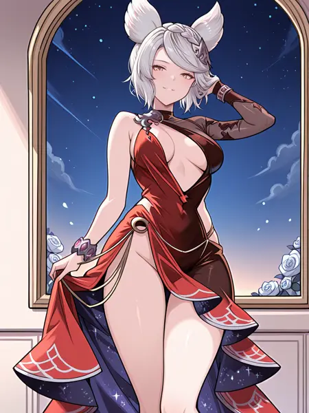 dvl_fr, dvl_flb, braid, short hair, grey hair, animal ears, yellow eyes, asymmetrical dress, evening gown, revealing clothes, red dress, multicolored dress, single bridal gauntlet, single silver bracelet, silver hairpin, heels, bare legs