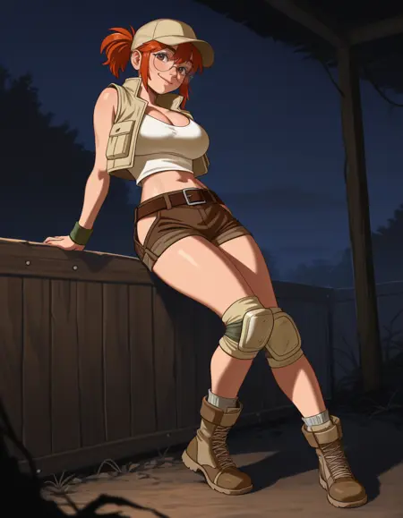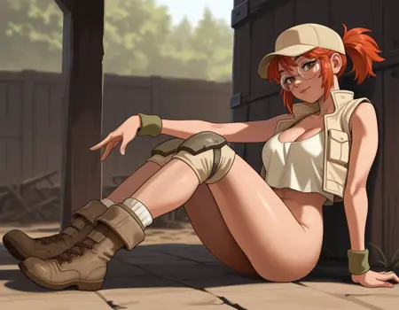 긍정적 프롬프트: 1girl, MSFio, 모자, 단발 붉은 갈색 머리카락, 갈색 눈, 안경, 둥글안경, 베이지색 조끼, 크롭탑, 소매 없음, 팔찌, 벨트, 갈색 반바지, 짧은 반바지, 허리 통풍구, 무릎 보호대, 부츠