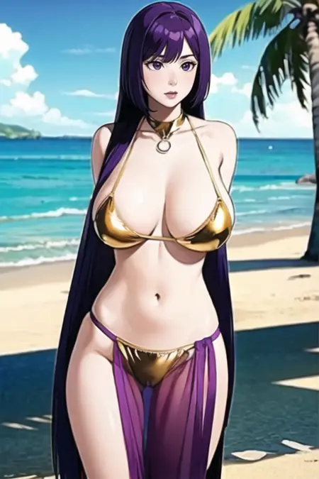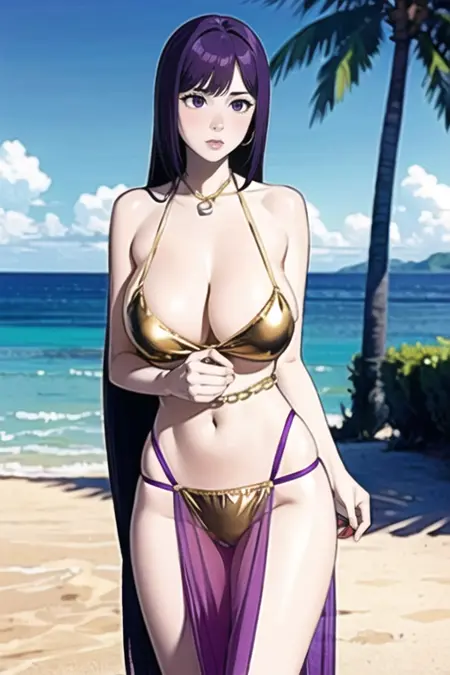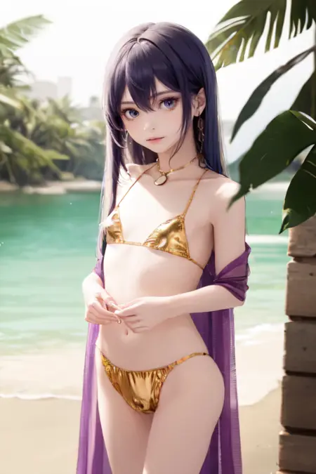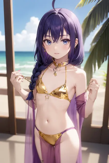 推荐触发词(Recommended trigger words):1girl,solo,breasts,gold,jewelry,swimsuit,purple skirt,(chain:1.2),bikini,(gold chain:1.2),(see-through:1.1),(harem outfit:1.4),topless,
