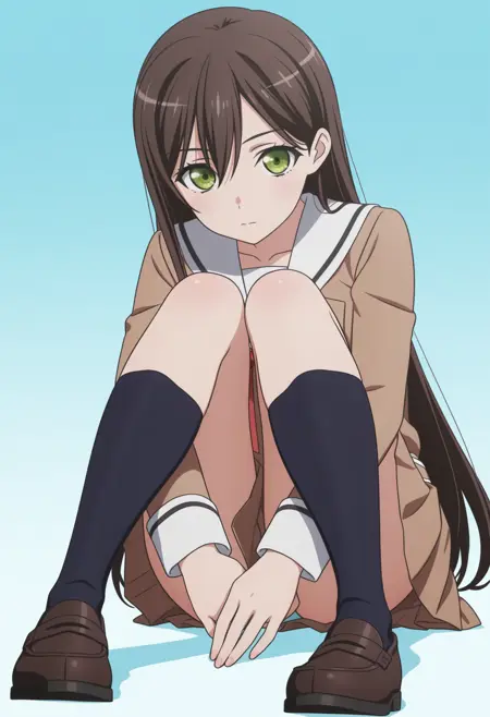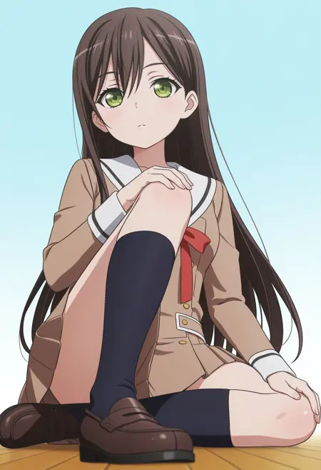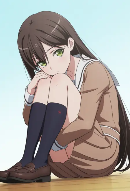 花咲川学园制服,白色水手领,水手服,棕色上衣,红色丝带,颈饰丝带,棕色短裙,过膝袜,深蓝色袜子,乐福鞋,