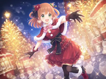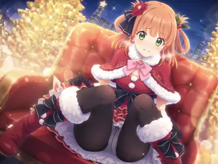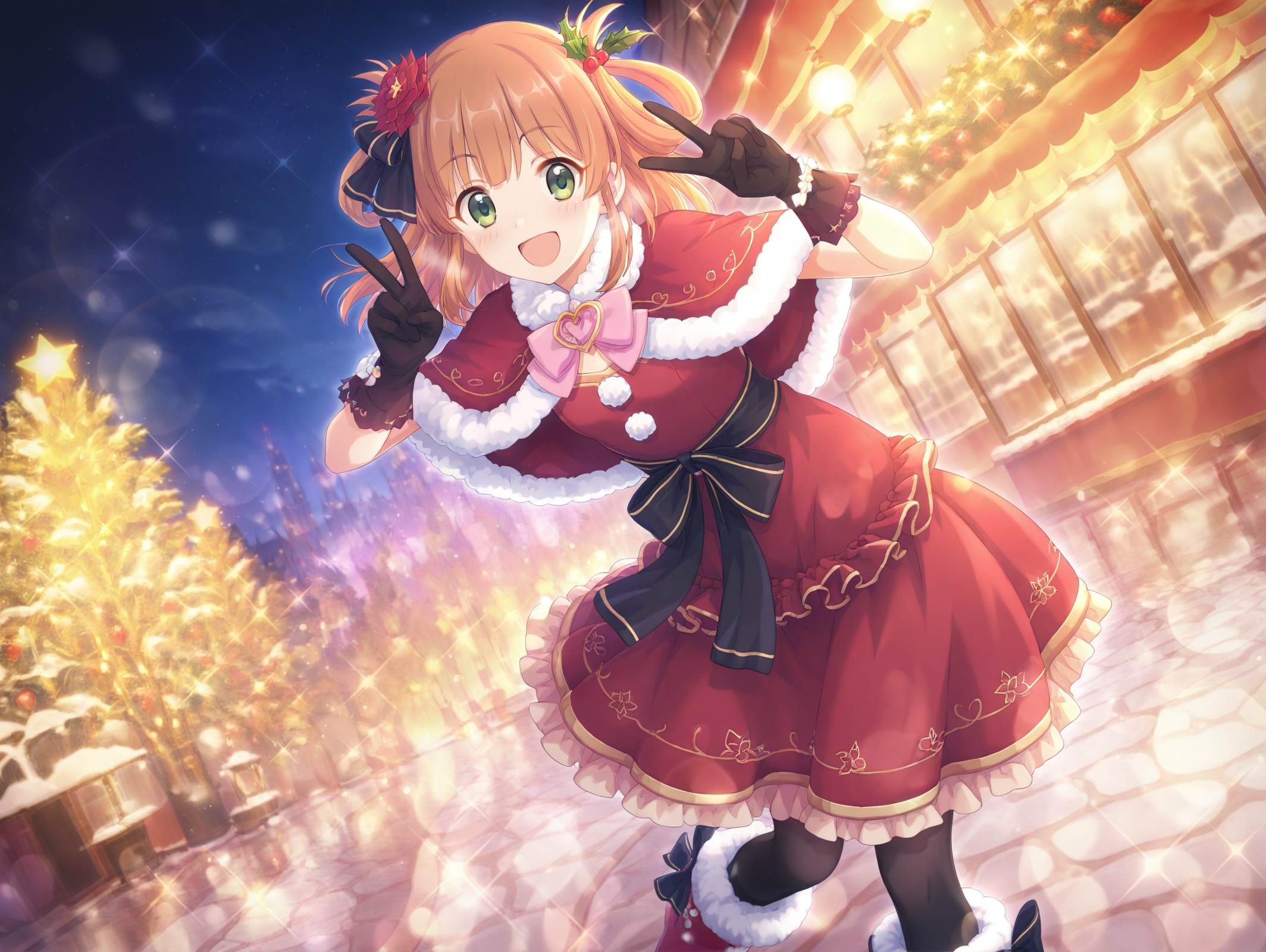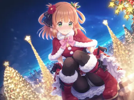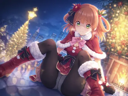 disgust,shaded_face,absurdres,official style,lora:Rino5464:1,1girl,red capelet,hair flower,green eyes,hair ornament,fur-trimmed capelet,fur trim,red footwear,black gloves,boots,pantyhose,red dress,fur-trimmed boots,dress,hair rings,red flower,black pantyhose,holly hair ornament,brown hair,pink bow,black bow,night,sitting,dress_lift,cityscape,white_panties,m_legs,