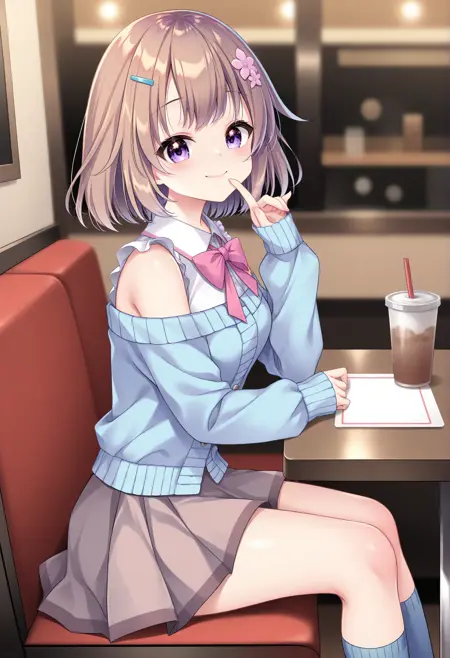 parallel hairclips,hair flower,casual,blue cardigan,brown skirt,white shirt,blue socks,long sleeves,sleeves past wrists,collared shirt,pink bowtie,frilled shirt,sleeveless shirt,pleated skirt,miniskirt,