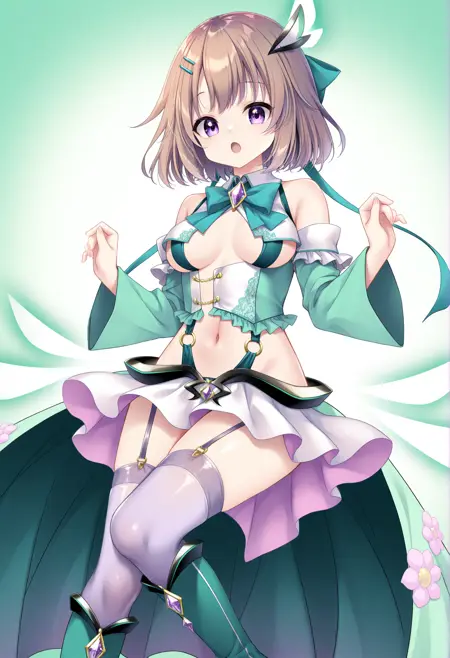 wing hair ornament,parallel hairclips,hair ribbon,green ribbon,hair bow,green bow,magical girl,energy wings,low wings,green wings,revealing clothes,detached sleeves,garter straps,white skirt,pleated skirt,long sleeves,clothing cutout,wide sleeves,two-tone corset,green corset,white corset,frilled corset,layered sleeves,white sleeves,green sleeves,white frills,purple gemstone,green frills,green bowtie,detached collar,white collar,purple brooch,layered skirt,two-sided skirt,high-low skirt,green skirt,purple skirt,gradient skirt,flower skirt,two-tone skirt,o-ring,purple thighhighs,thighhighs under boots,knee boots,green footwear,