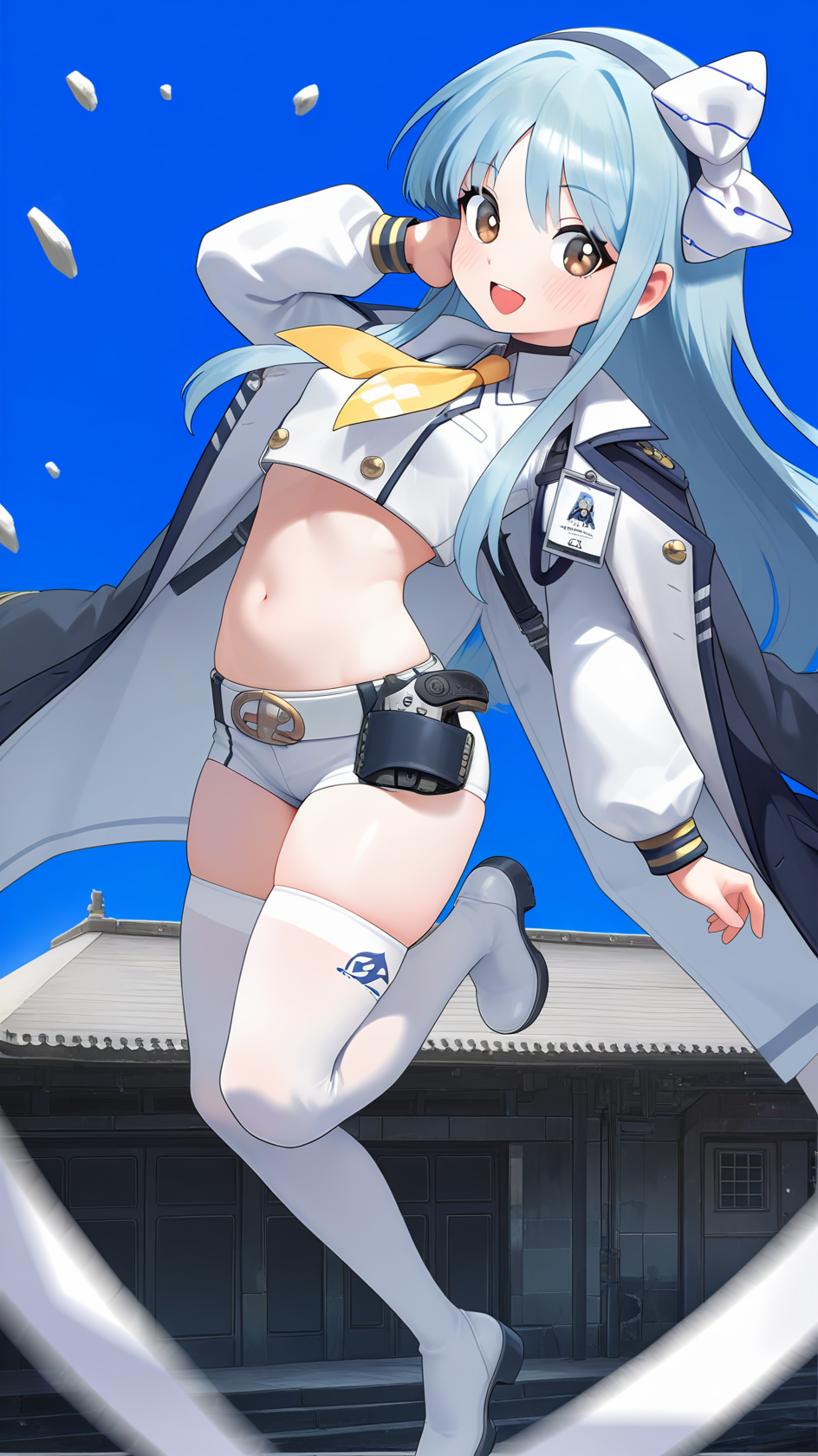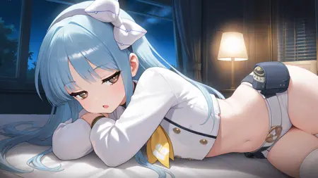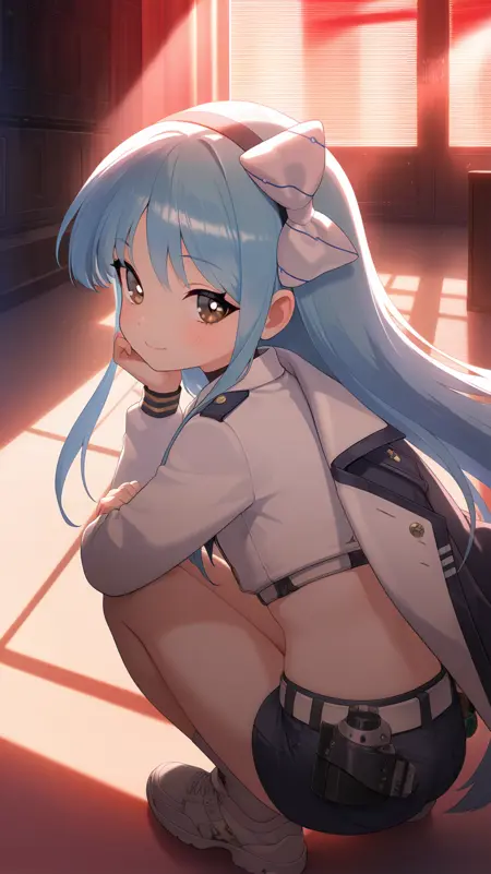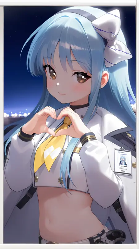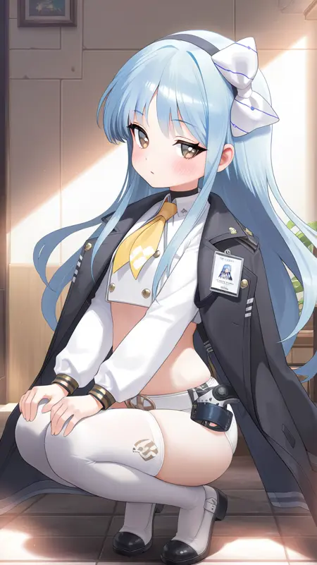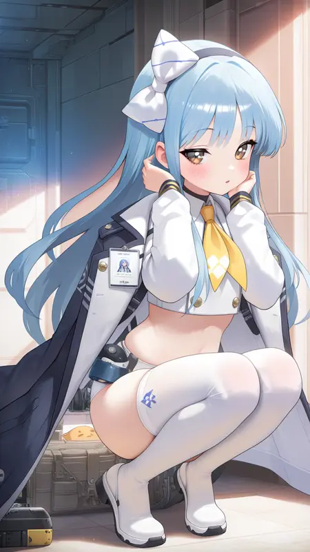 Example prompt : bangs, belt, blue hair ,very long hair, blush, bow, brown eyes, crop top, hair bow, hairband, , long sleeves, ,navel, open clothes, open jacket, puffy sleeves, skindentation, thighhighs, white bow, jacket, white shirt, white shorts, short shorts, id card, midriff, yellow tie