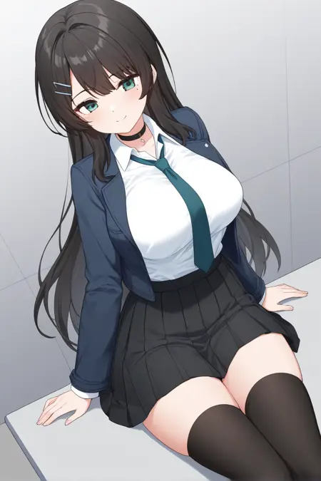 kkKei, 1girl, long hair, black hair, large breasts, mole under eye, hair ornament, green eyes, hairclip, black thighhighs, dark blue jacket, black choker, white buttoned_shirt, pleated skirt, black skirt, long sleeves, open jacket,