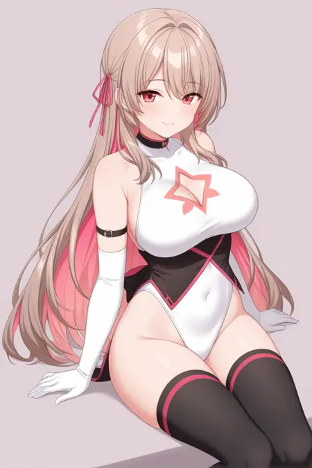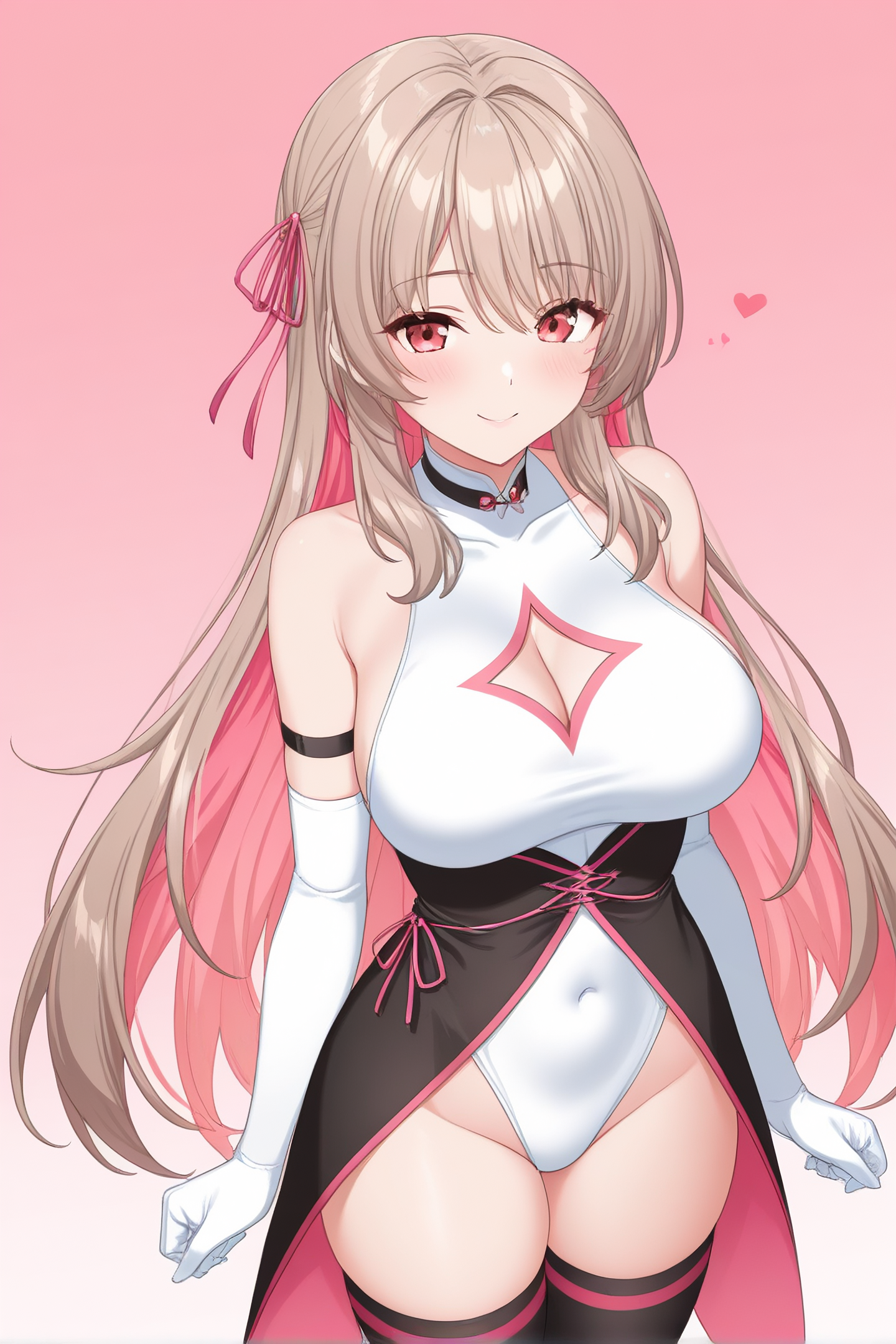 Revantia,1girl,large breasts,long hair,two-tone hair,red eyes,multicolored hair, light brown hair, bangs, ribbon, colored inner hair,covered navel,cleavage cutout, leotard,elbow gloves,clothing cutout, cleavage, white gloves, bare shoulders, black thighhighs, white leotard,