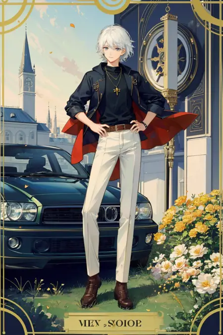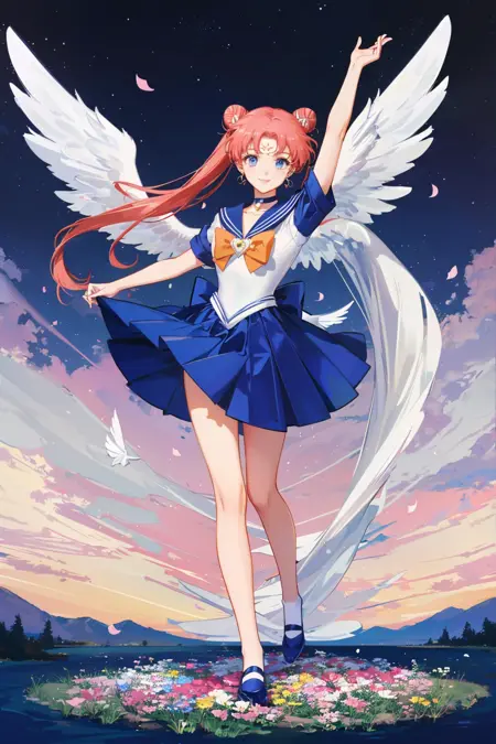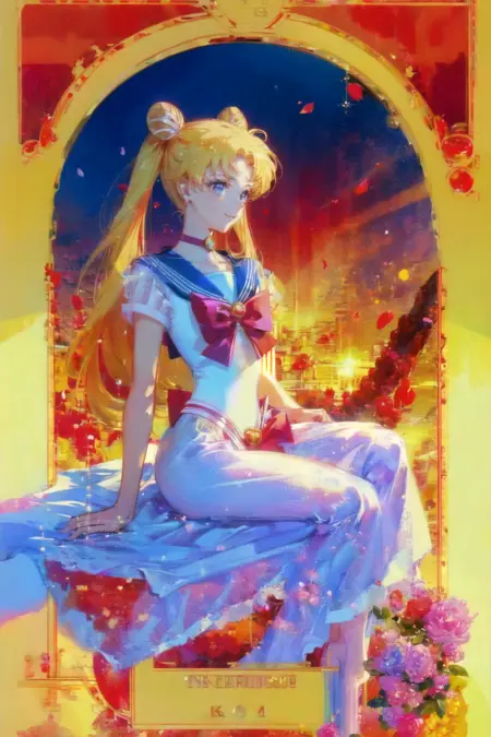 lora:SailorMoonTarot:.7, Tarot Card, art noveau style, masterpiece, best quality, ultra-detailed, highres), perfect face, sidelighting, lustrous skin,(bloom), (shine), lighting, ray tracing, sci-fi, city, outdoor, white choker, white sailor collar, choker, closed eyes, long hair,double bun, white hair, hair bun, brooch, twintails, facial mark, wings, 1girl, jewelry, forehead mark, skirt, signature, feathers, white theme, hair ornament, staff, dual persona, solo, very long hair, dress, bare legs, depth_of_field,very detailed background, highly detailed background, Masterpiece, Ultra detailed, great composition,Dynamic angle,[Bottle bottom],(wide shot), extremely delicate and beautiful,(Highest picture quality), (Master's work), (fantasy), depth of field, solo,Beautiful girl,extreme light and shadow, masterpiece, rich in detail, (fine features), (highest quality), (masterpiece), (detailed eyes), (beautiful) detailed girl,beautiful detailed eyes,(straight-on), full body, flower field:1, flower petals falling, summer:1.2, happy, smile,(extremely detailed CG unity 8k wallpaper),(masterpiece), (best quality), (ultra-detailed), (best illustration),(best shadow),perfect lighting , perfect anatomy ,